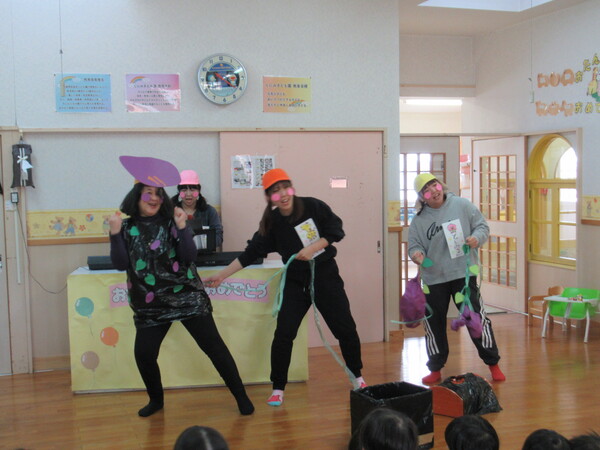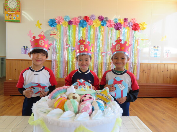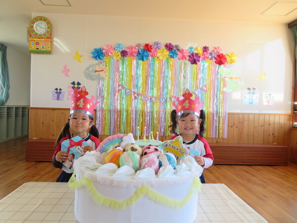 今月は年少さん2名・年長さん3名がお誕生月を迎えました。みんなの前で緊張している様子もありましたが、しっかりみんなに聞こえる声でインタビューに答えてくれました。お楽しみ会では新しいお友だちの「あんちゃん」が登場し、みんなと一緒にクイズに挑戦しました!