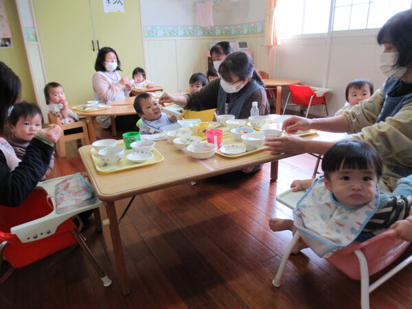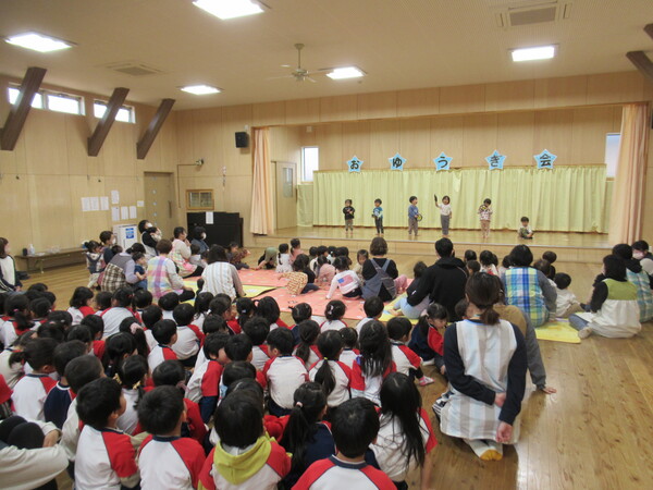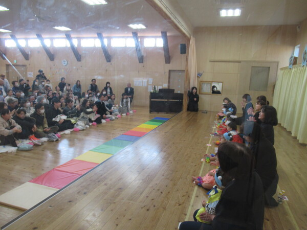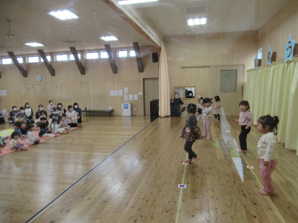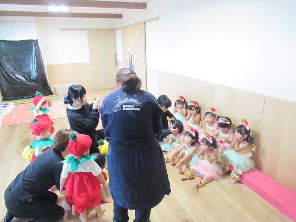 くにみ子ども園は今週の土曜日に0・1・2歳のおゆうぎ会があります。今日は、幼稚園のお友だちがお客さんとしてダンスを見に来てくれました。ひよこ組のうたあそび「おもちゃのチャチャチャ」歌に合わせて手をたたいてくれたり、終わった後も「かわいかった〜」と教えてくれました。0・1・2歳のみんなも、喜んで手を振ったりダンスをがんばったり緊張したり・・・さまざまでした。本番も子どもたちの可愛い姿をお見せできれば、と思います☆