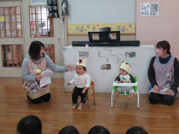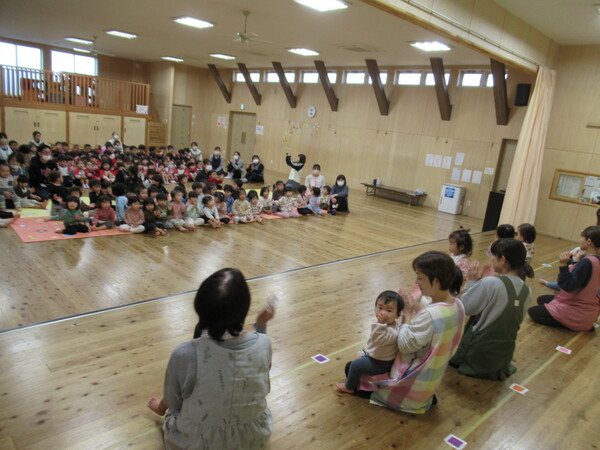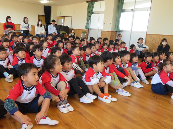 27日に11月生まれのお友だちのお誕生会をしました。みんなの前にでるのを恥ずかしがる様子も見られましたが、先生と一緒に出ることができました。お楽しみでは芋ほりの劇があり楽しそうに見ていた子どもたちでした。