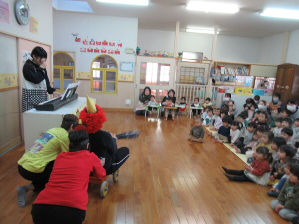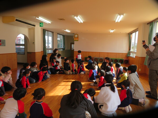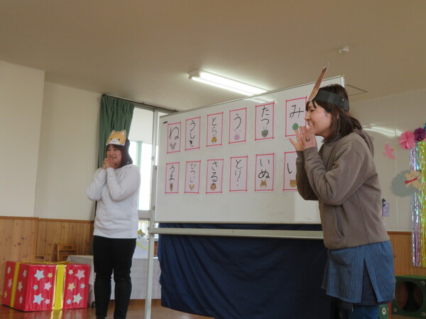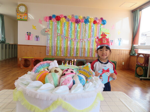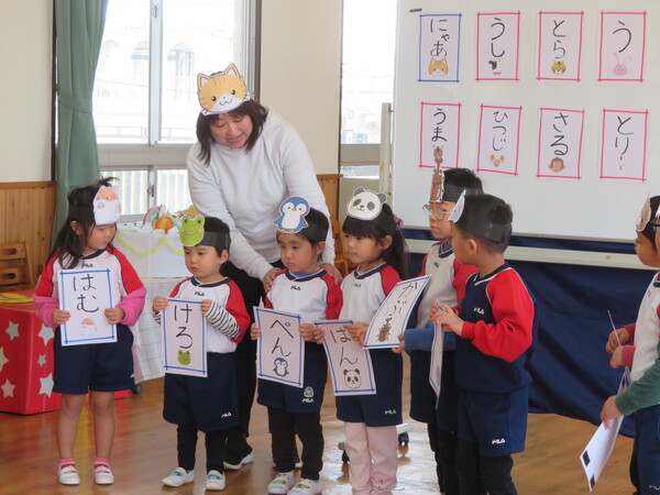 今月は7名のお友だちが誕生月を迎えました。大きな声でインタビューに答えたり、園長先生の話に元気に返事したりと大きく成長したところを見せてくれました。ローソクも息を合わせて吹き消すとみんなからは歓声が上がり、嬉しそうな笑顔が印象的でした。お楽しみ会では干支に因んだお話や十二支の仲間に入りたい他の動物たちを誕生月のお友だちに演じてもらうなど、子ども達も参加してのお楽しみ会となり、見ている子どもたちも大いに盛り上がって楽しんでいました。