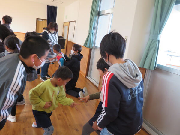 あおぞら組と多比良小学校の5年生との交流会がありました。5年生からの質問に保育士が答える場面では、子ども達が真剣に聞きメモを取っている姿が印象的でした。その後は、みんなでじゃんけん列車や人数あつめゲームをして楽しみました。5年生が園児の目線に合わせてじゃんけんをしたり、話をするなど園児との関り方で学んだことを早速実践してくれていました。卒園児の成長した姿も見られて嬉しかったです。あおぞら組さんも優しいお兄さん・お姉さんと一緒に遊べて次の交流会がまた楽しみになっていました。
