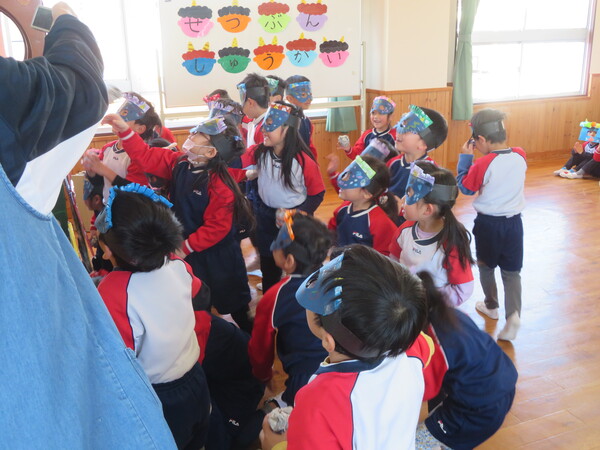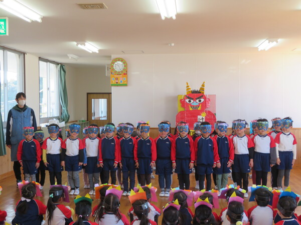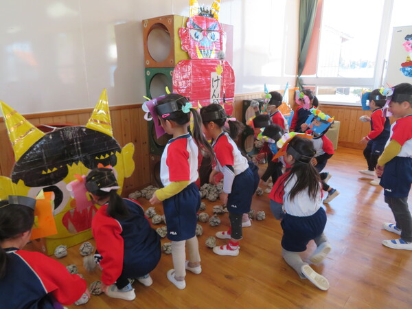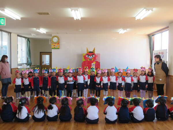 幼稚園舎では節分集会を行いました。今日が節分の日にあたり、明日から季節が春になることや節分にちなんだクイズもあり楽しく節分について知る事ができました。各クラスから『心の中から追い出したい鬼』では【イヤイヤ鬼・泣き虫鬼・人任せ鬼・いじわる鬼】を追い出すという発表がありました。その後はみんなで年長さんを鬼役にして豆まきを行っているところに・・・赤と青の鬼が登場しました!!びっくりして逃げ回る子、勇敢に鬼に向かって豆を投げる子と様々でしたが、みんな一生懸命頑張りました‼最後はちょっぴりドキドキしながら鬼さんと一緒に写真撮影を行いました。