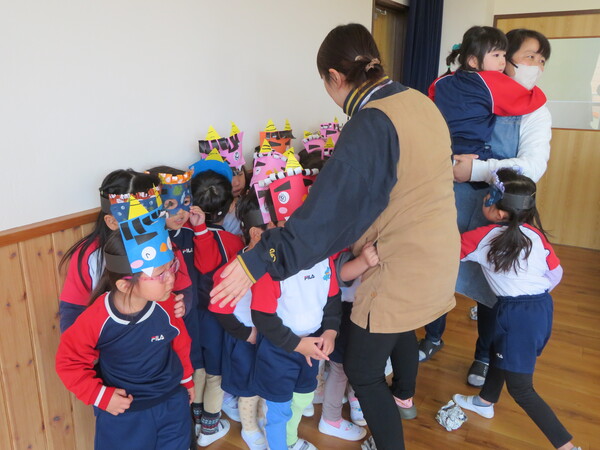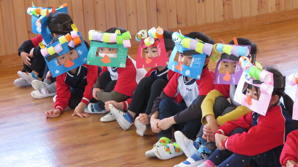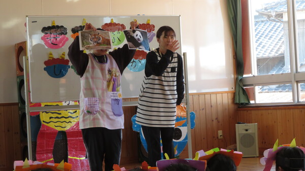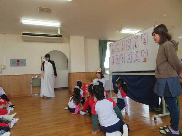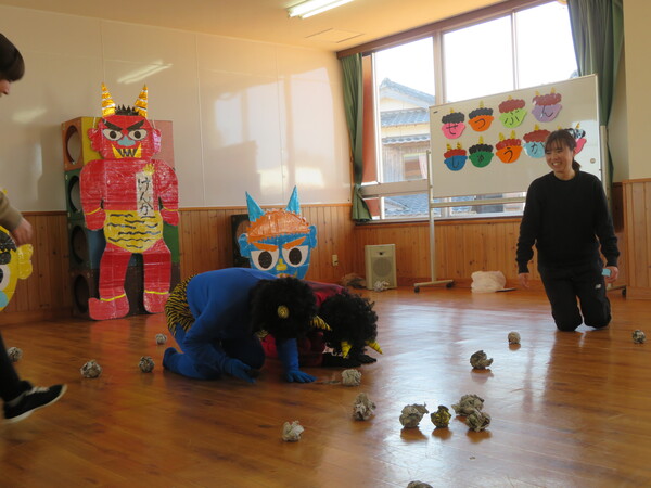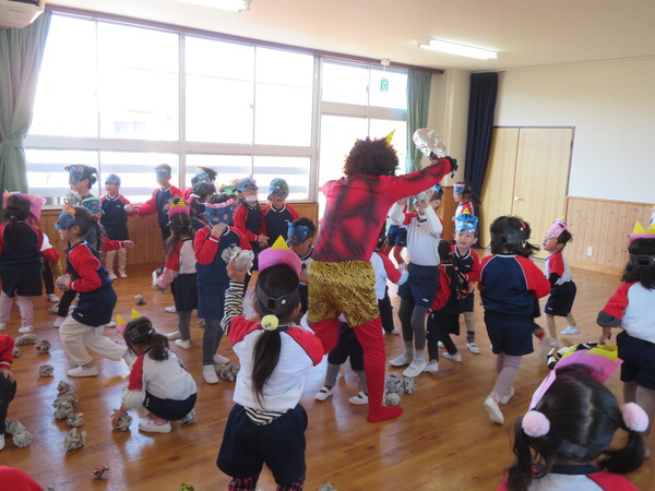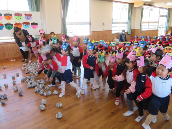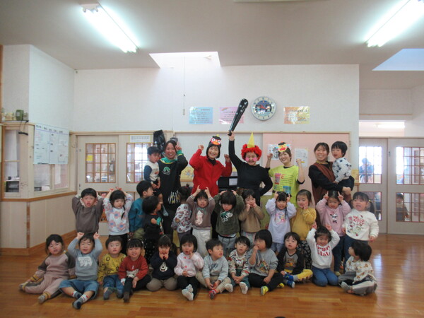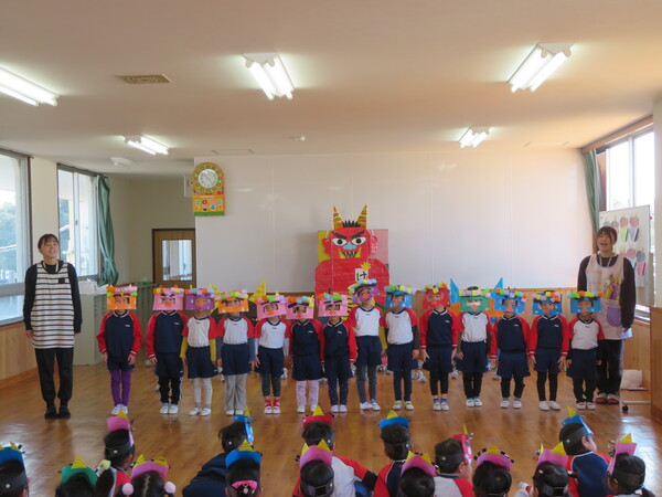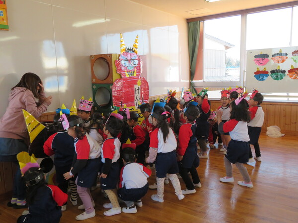 2月生まれのお友だちの誕生会がありました。みんなの前にでて、名前と何歳になったのかと好きな食べ物をインタビューされました。緊張している姿も見られましたが、その姿にも成長を感じました。お楽しみでは、2月3日の節分に合わせて「ニコニコ鬼・泣き虫鬼・怒りんぼ鬼」が登場しました。手押し車に乗って怒りんぼ鬼が登場すると泣いてしまう子もいましたが興味津々に見ていた子ども達でした。