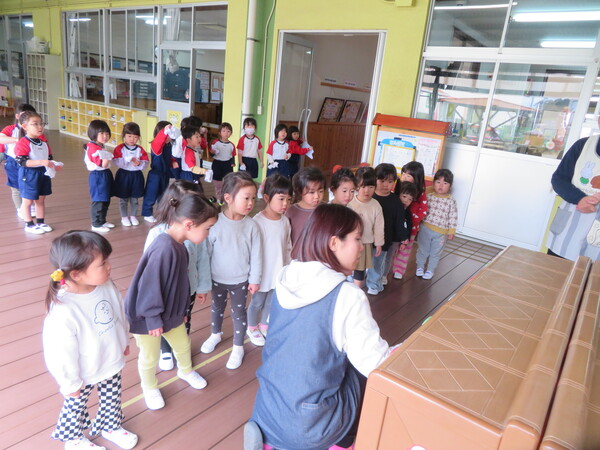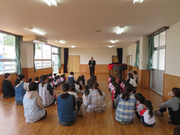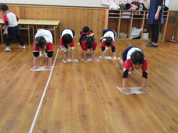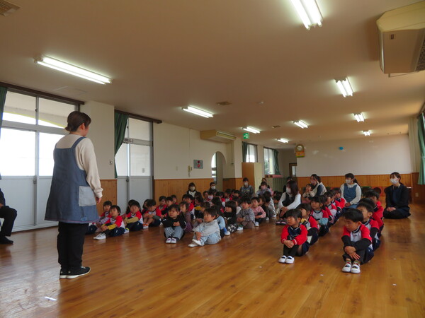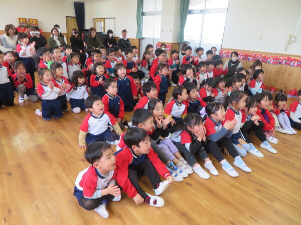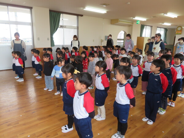 修了式をきりん組さん、ひかり組さん、ほし組さんで行いました。きりん組さんは初めての参加でしたが、体操座りで園長先生たちのお話しをしっかり聞くことができていました。今日から4月の進級するクラスの準備期間を元気に過ごしてもらうための4つの合い言葉「早寝・早起き・朝ごはん・歯磨き」をイラストを使って確認しあいました。