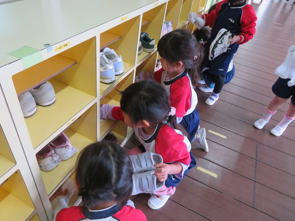 修了式後は、みんなで大掃除をしました。ひかり組さんとほし組さんは、くつ箱やお部屋、廊下を雑巾がけして隅々まできれいにしてくれました。きりん組さんは、先生からくつ箱の並べ方を教えてもらうと、かかとをしっかりそろえて並べることができていました。