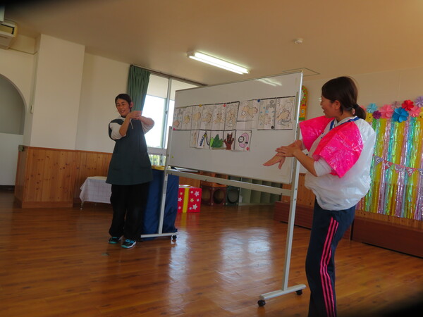 その後はこれから流行が心配される感染症を防ぐために【手洗い】の仕方を再確認しました。絵をみながら「すべり台洗い...おおかみ洗い...」等と声と動作を交えながらみんなで確認しました。