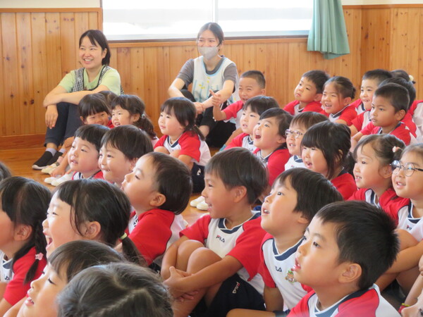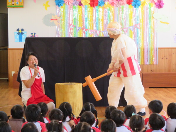 3日に9月生まれのお誕生会を行いました。いつもは元気なお友だちも少し緊張していましたが、がんばってインタビューに答えていました。お楽しみ会では読書の秋ということで「あのやまこえて どこいくの」の手作り大型絵本が登場すると興味津々で楽しみながら見ていました。その後は、中秋の名月のお話があり、うさぎさんがお月見用のおもちをついたり、クールポコに扮した保育者のもちつきでは「こんな先生がいるんですよ〜」「な〜に? やっちまったな」との掛け合いにみんな大爆笑(≧▽≦)だんご積み競争もハプニングがあったりして大いに盛り上がりました。