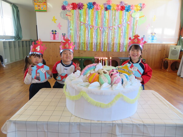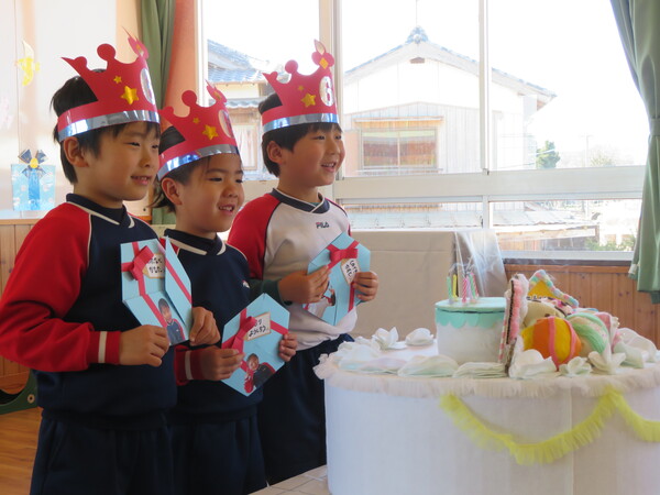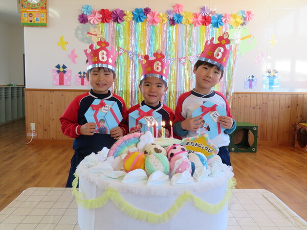 2月は年少児3名、年長児3名のお友だちがお誕生月を迎えました。年少さんもインタビューではしっかり大きな声で答え、年長さんは様々な質問にもしっかりと答える事ができていました。お楽しみ会では先生たちが「こぶとりじいさん」の劇を演じ笑いあり、音楽に合わせてのダンスもあって今月も楽しいお誕生会となりました。